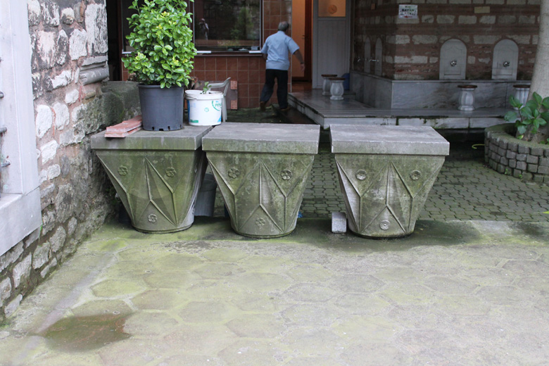 İshak Paşa Camii'nin bir depremle yıkılmış olan sson cemaat yerine ait olan sütun başları.